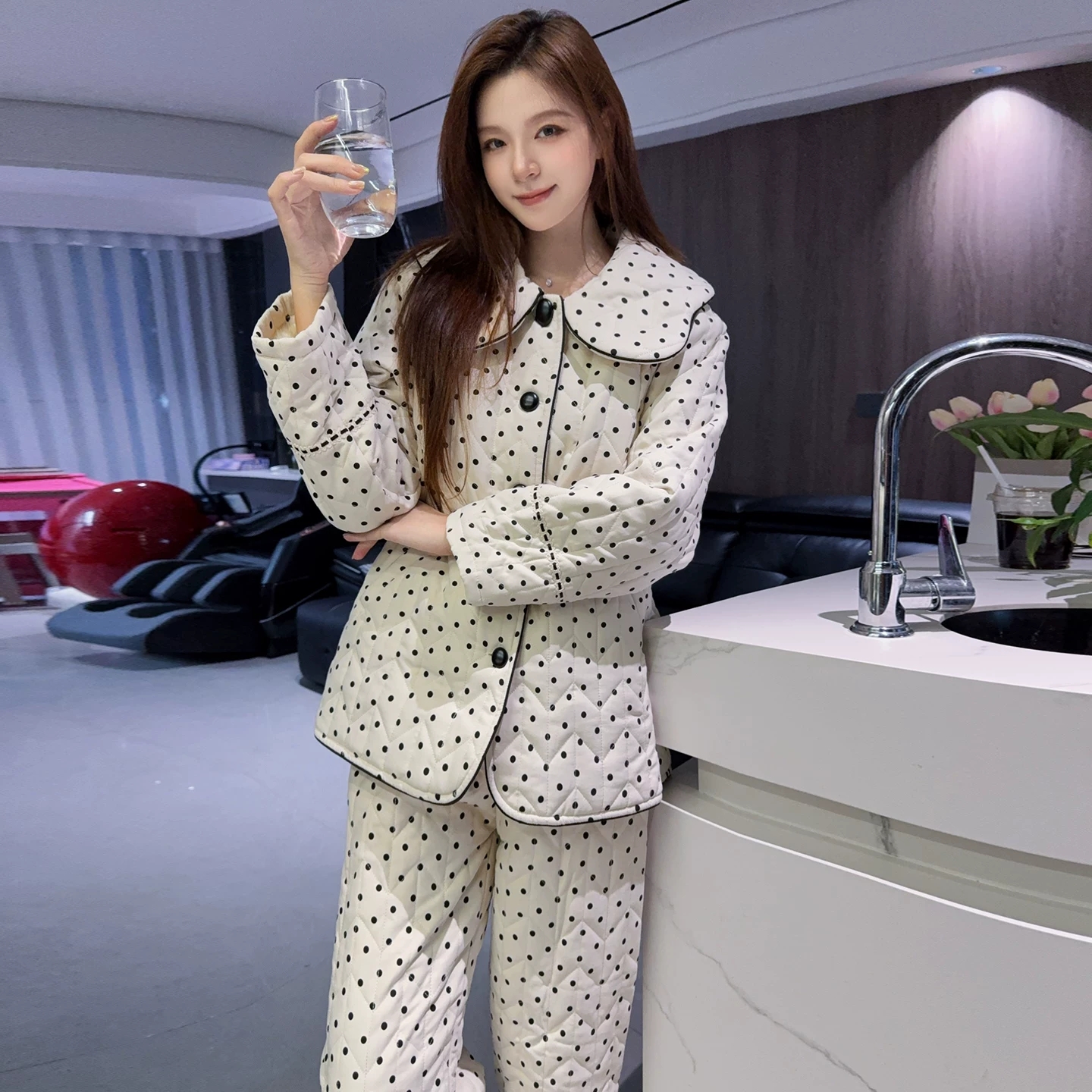 新款波点夹棉家舒适宽松柔软高品质居服套装可外穿