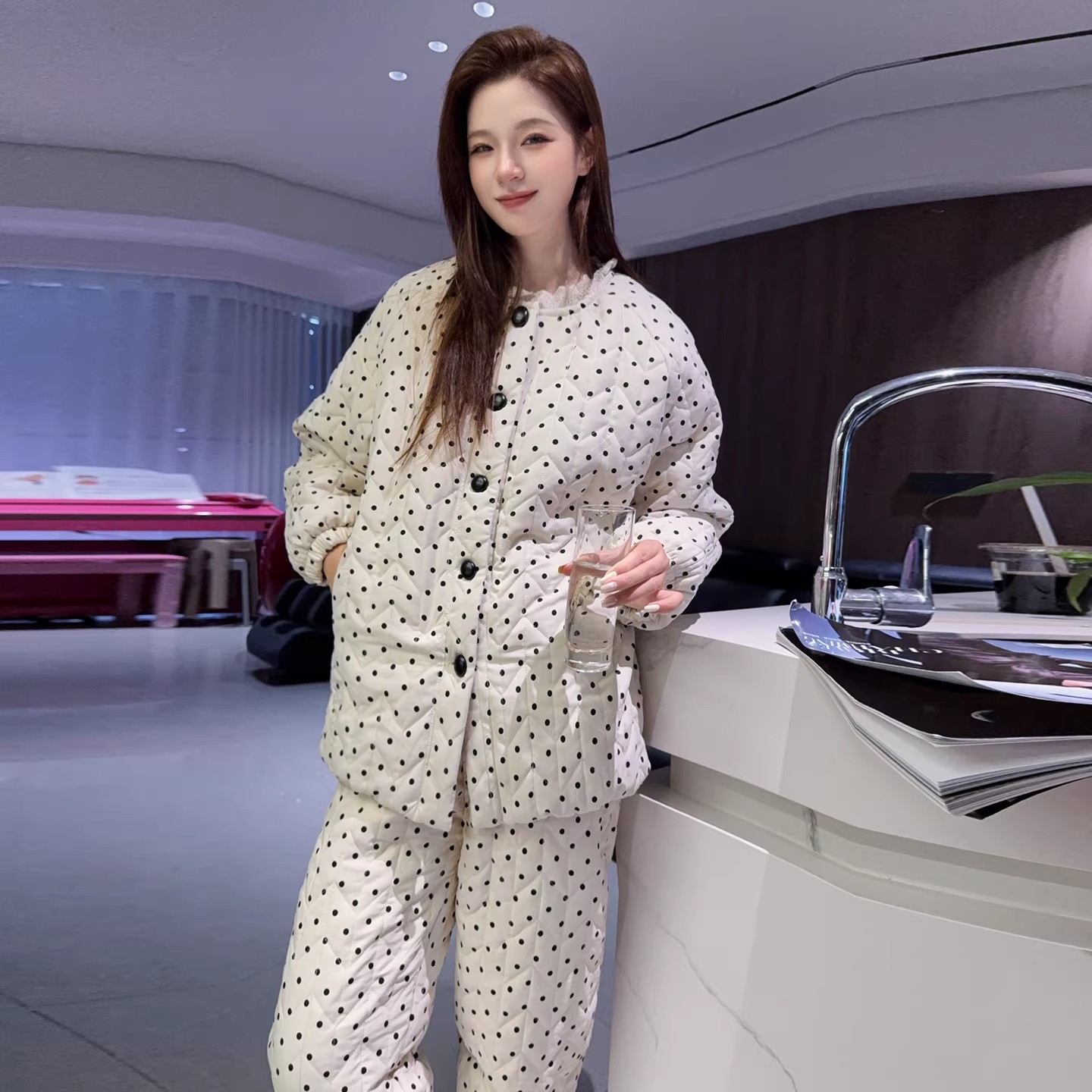 新款加绒加厚保暖夹棉波点青春少女感清新家居服