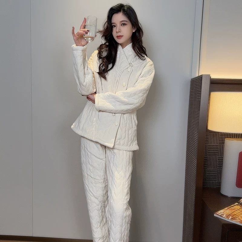 款中式睡衣女冬季三层夹棉袄加绒加厚国风可外穿家居服