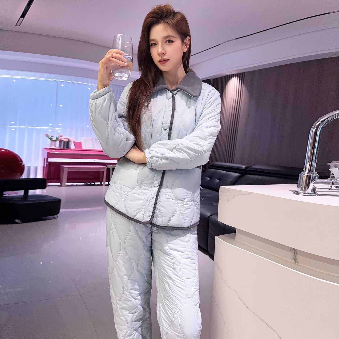 三层夹棉袄纽扣防水简约风加绒家居服
