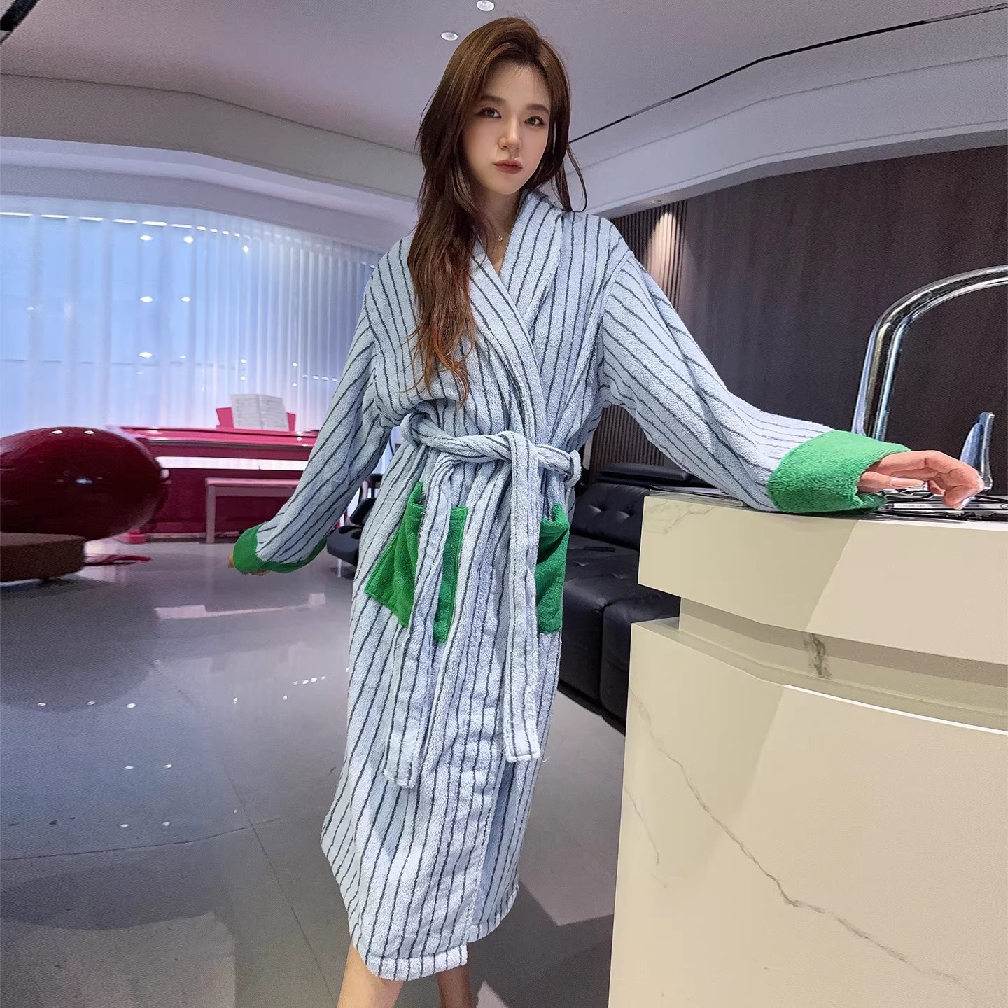 时尚条纹全棉浴袍吸水速干