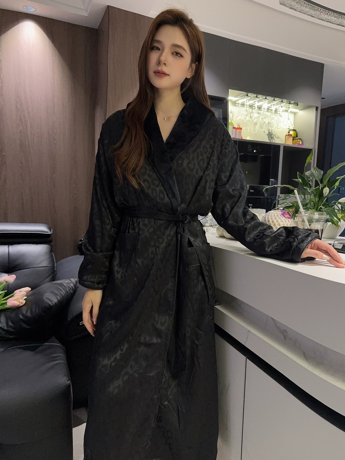 黑色性感豹纹睡袍