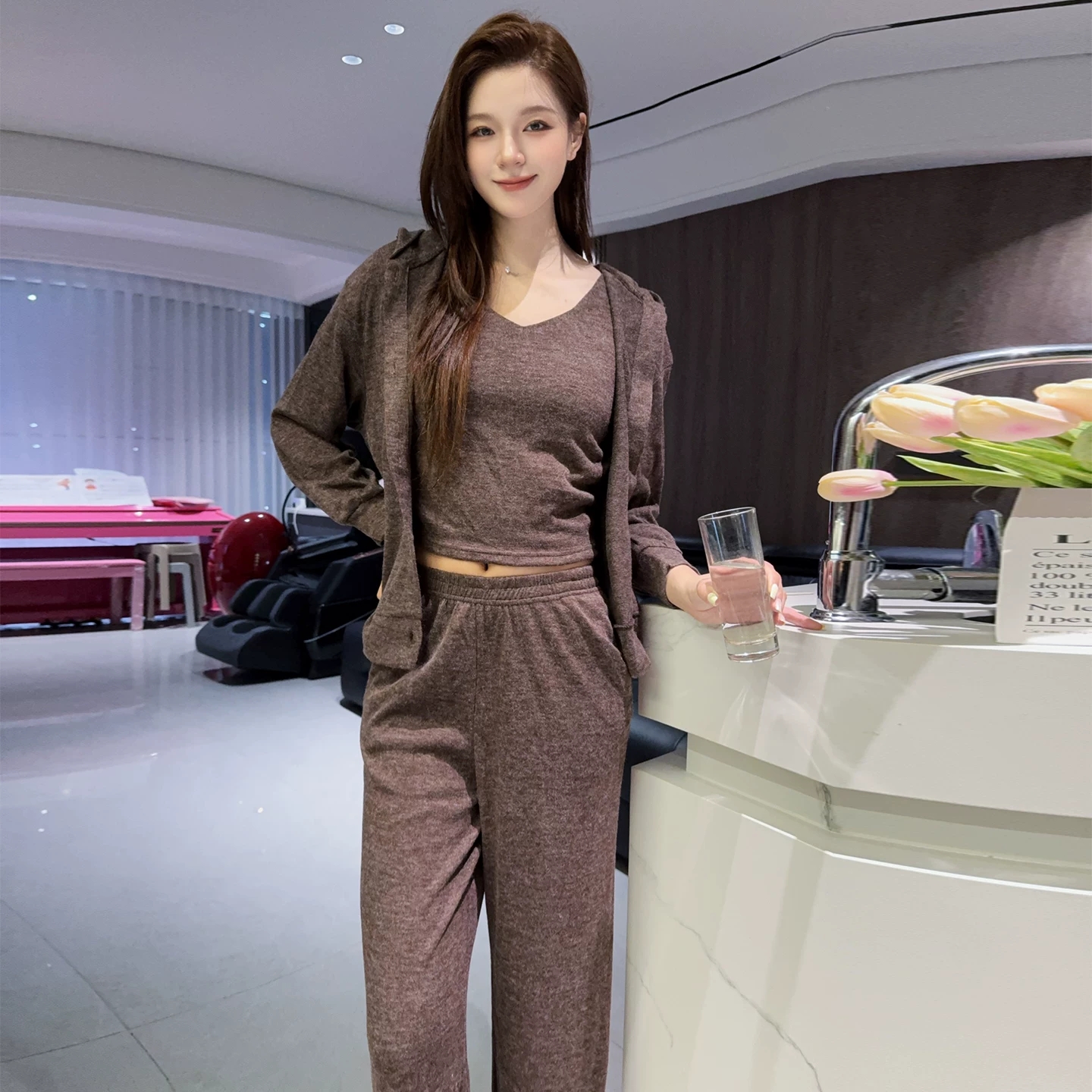 新款带胸垫开衫背心三件套装