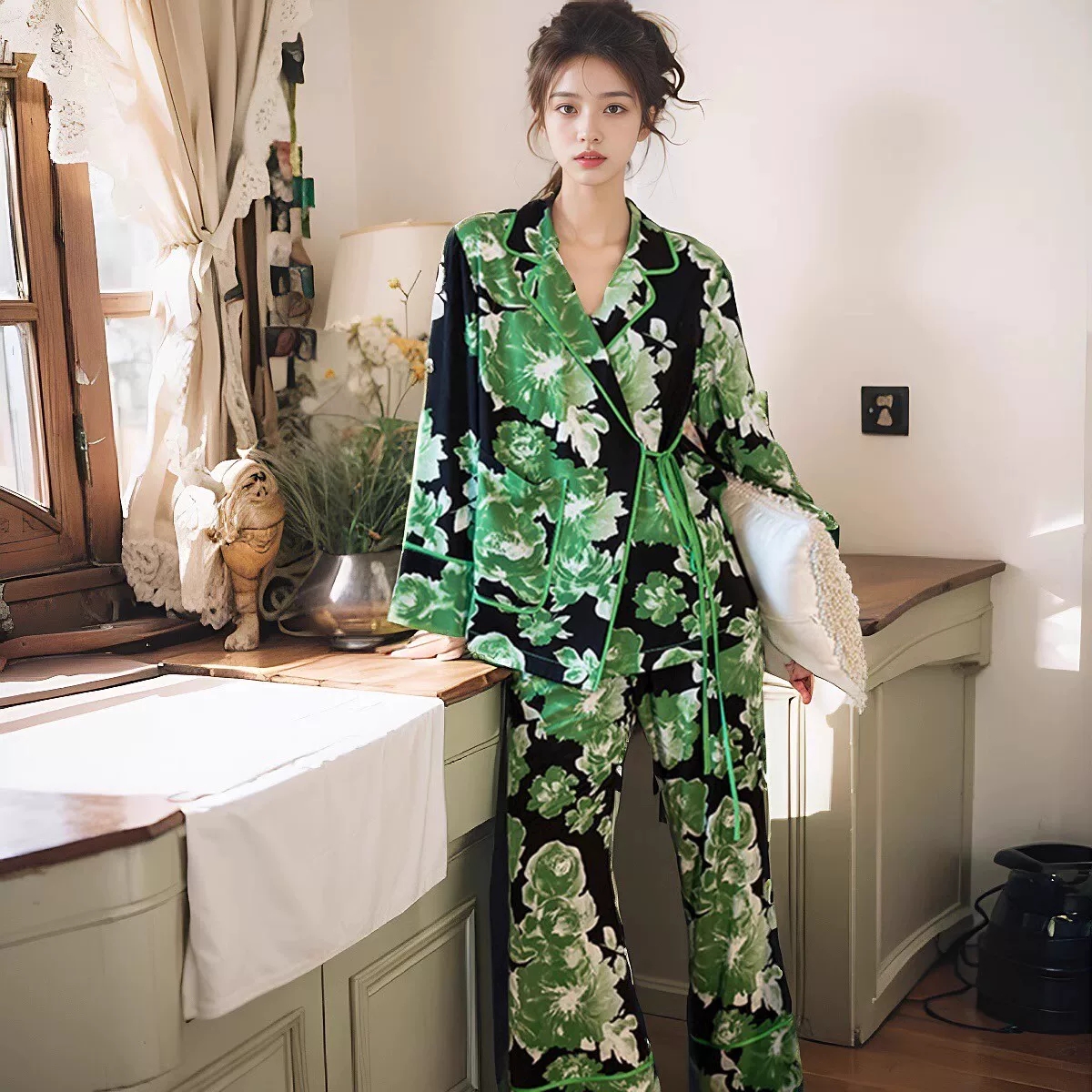 门襟绑带撞色两件套冰丝绸