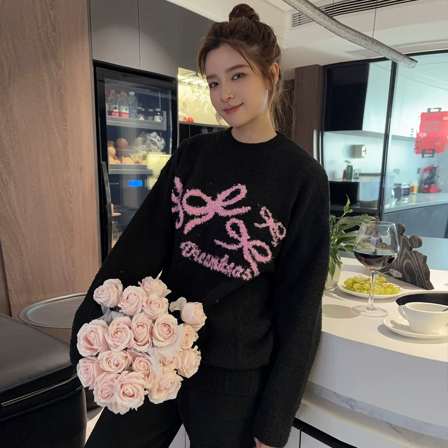 黑色半边绒保暖加绒冬季圆领家居服