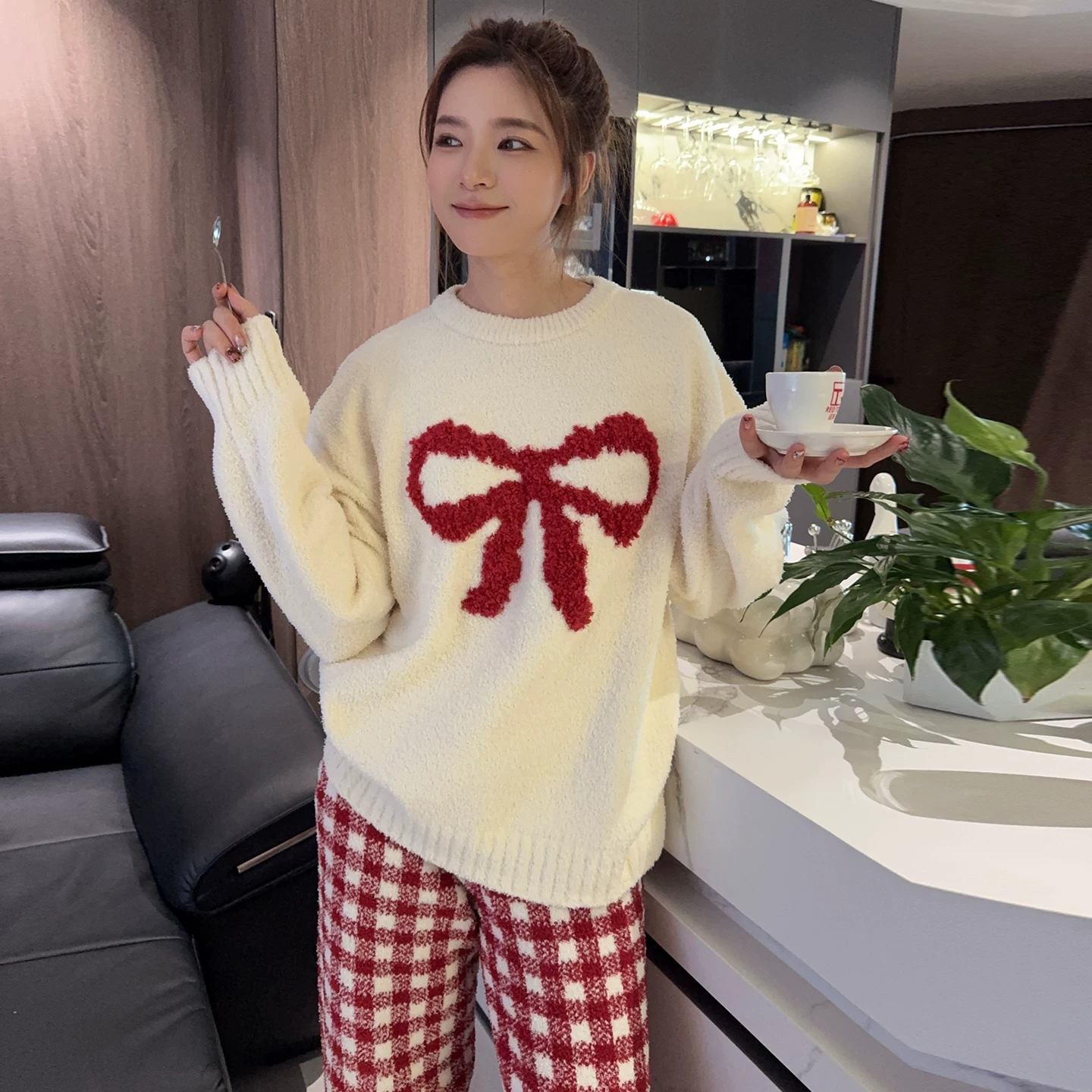 加绒加厚秋冬款蝴蝶结格子圆领家居服