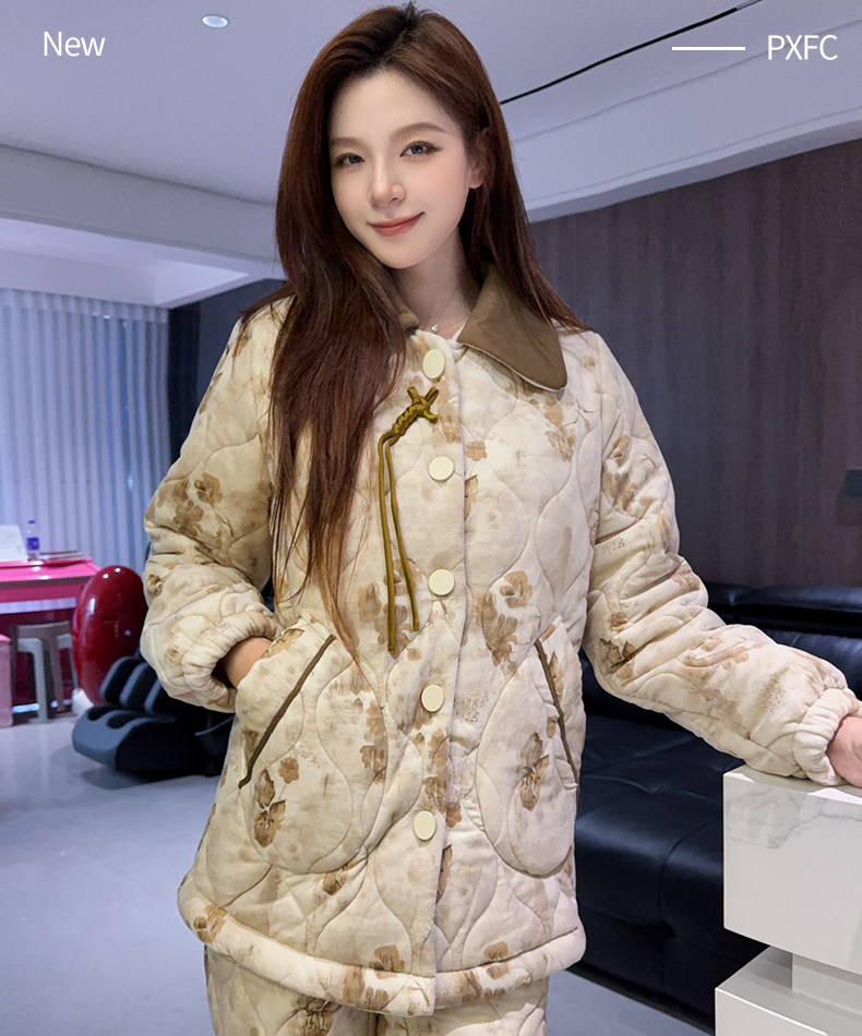 三层夹棉袄睡衣女冬季加绒加厚保暖